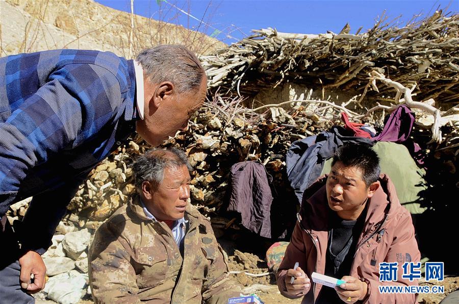 楚魯松杰鄉衛生院院長次仁頓珠(右)為楚魯松杰鄉巴卡村卡熱組阿孜冬季牧場的牧民送藥(12月22日攝)。