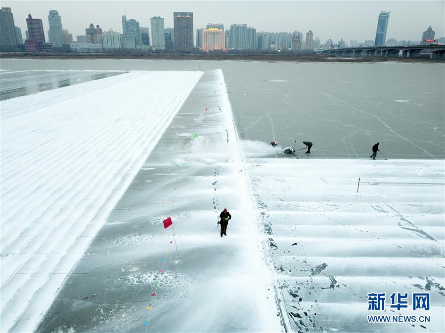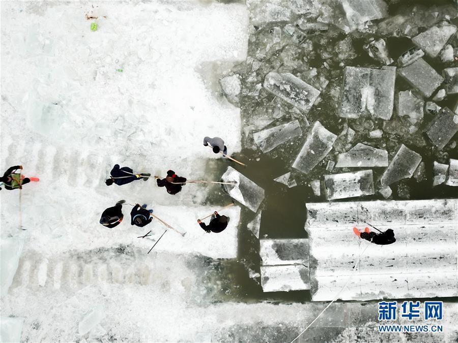 在松花江哈爾濱段江面,工人們在進行切割和采冰工作(12月12日無人機拍攝)。 黑龍江哈爾濱市的冰雪主題樂園哈爾濱冰雪大世界的采冰和建設工作近日拉開帷幕。為保證足夠的優質冰供給,每天有近千名采冰人和700多輛運冰車參與到采冰工作。 新華社記者 王松 攝