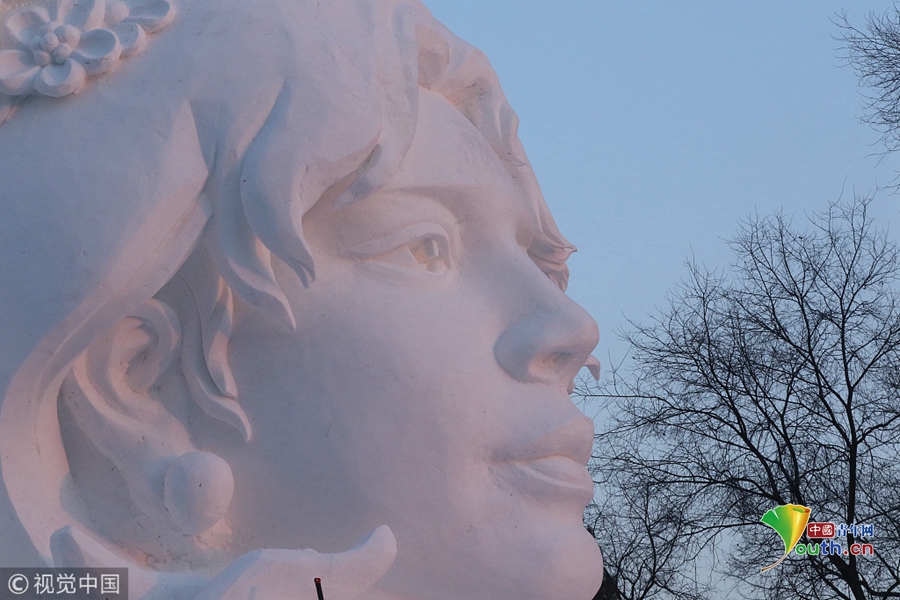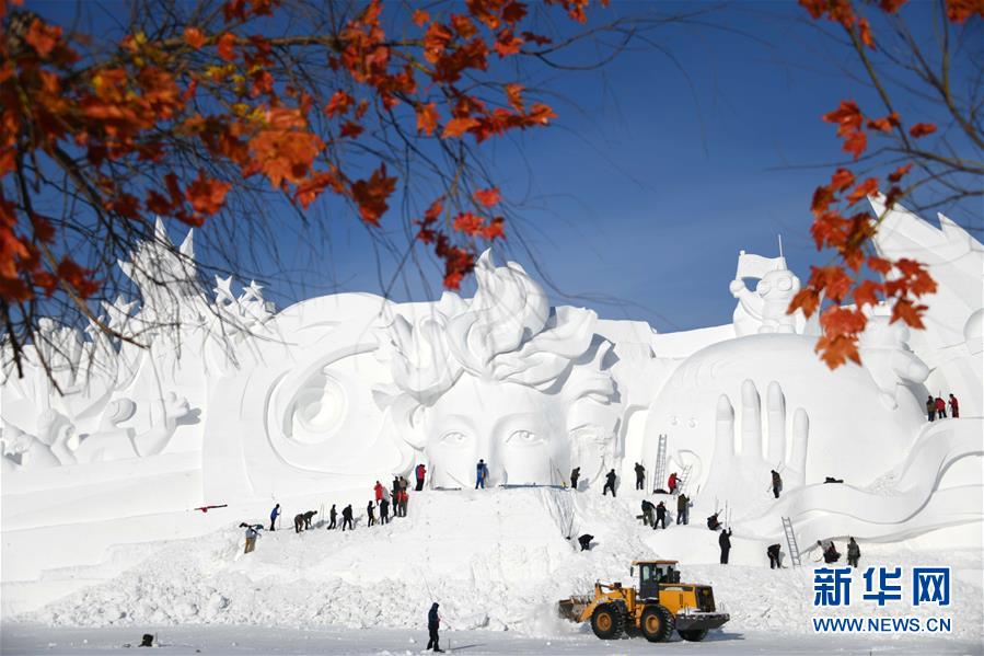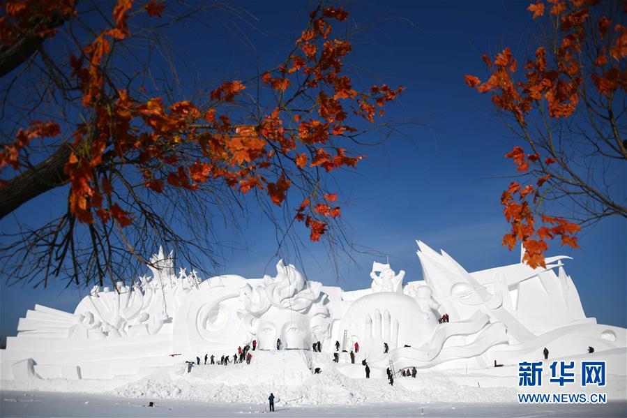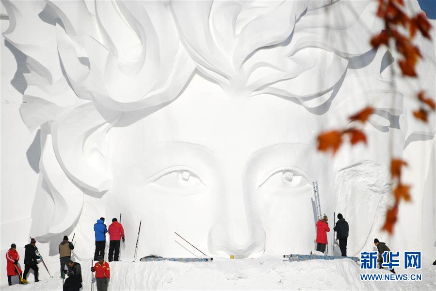 2018年12月13日,黑龍江省哈爾濱市,國內最大的雪雕盛會太陽島雪博會正在緊鑼密鼓建設中,部分雪雕雛形已現,雪雕師正在精雕細刻打磨中。