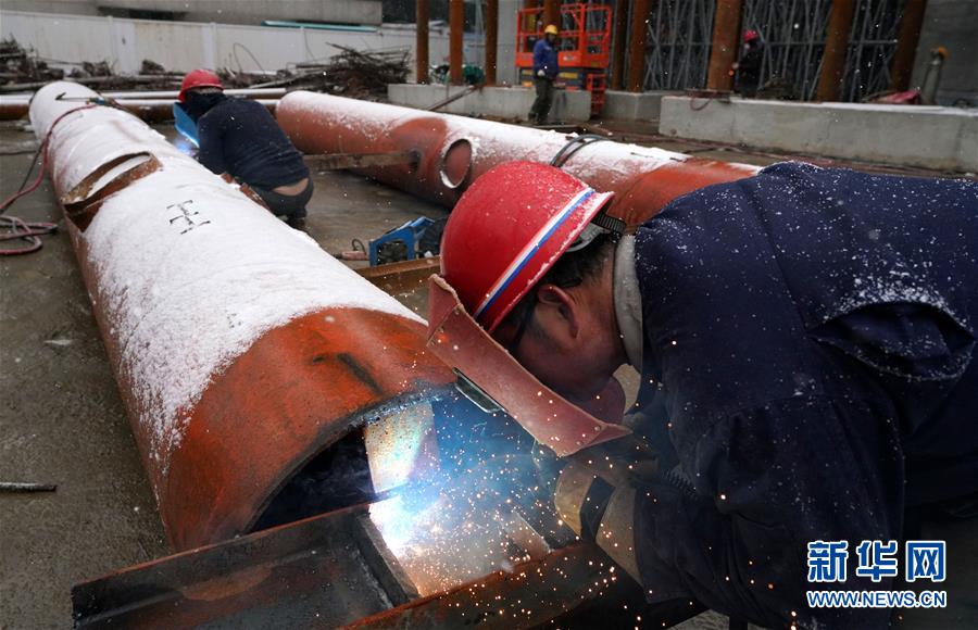 12月30日,南昌市洪都大道快速化改造工程項目工地上,中鐵四局五公司職工冒雪作業。新華社記者宋振平攝