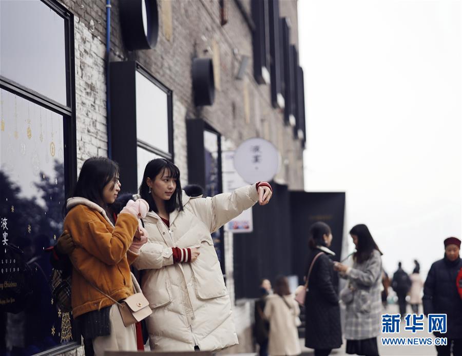 1月1日,游客在重慶鵝嶺二廠文藝街區內的一棟由老廠房改建的文藝咖啡館前自拍。