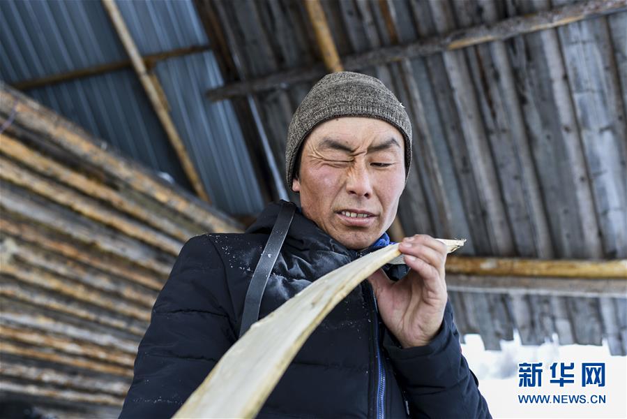 在新疆布爾津縣禾木村的一處冬季牧場,森格爾在制作毛皮滑雪板時(shí)檢查滑雪板的平面(1月3日攝)。新華社記者 胡虎虎 攝