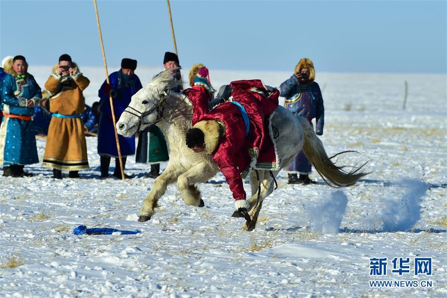 1月8日,牧民表演馬背拾哈達。 時下正值草原冬季旅游旺季,內蒙古自治區西烏珠穆沁旗的牧民們在雪原上一展身手,為游客展現獨特的民族風情。 新華社記者 鄒予 攝