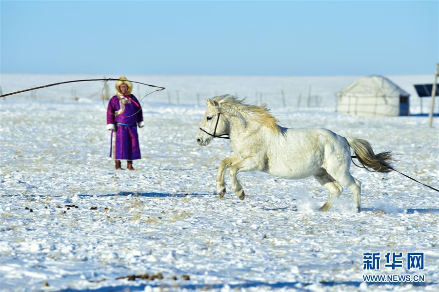 1月8日,牧民進行套馬表演。 時下正值草原冬季旅游旺季,內蒙古自治區西烏珠穆沁旗的牧民們在雪原上一展身手,為游客展現獨特的民族風情。 新華社記者 鄒予 攝