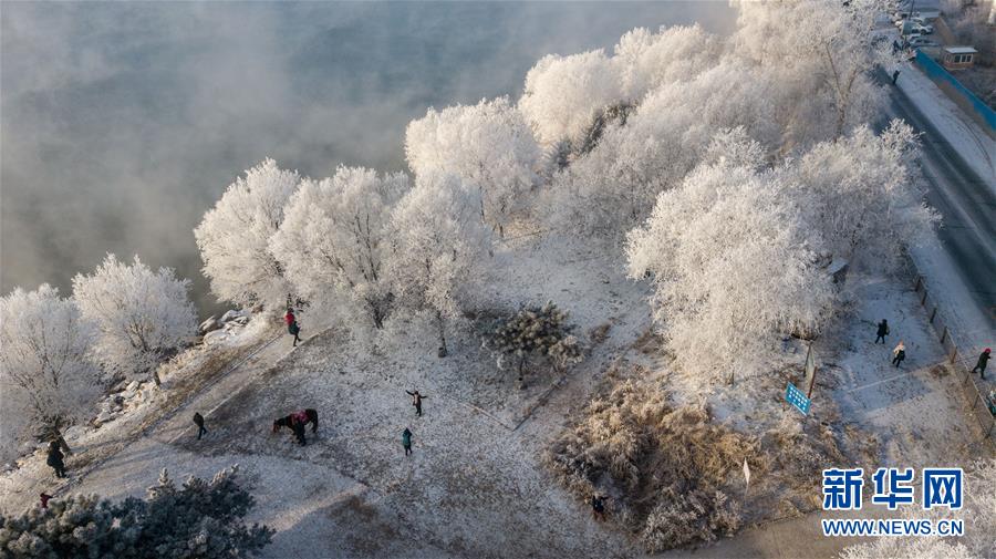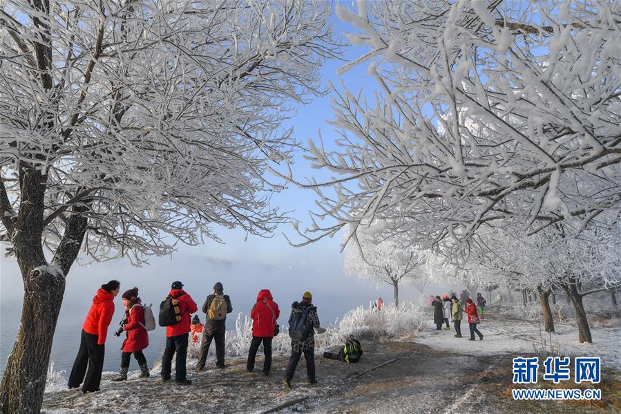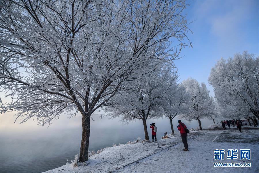 12月12日,游人在吉林省吉林市豐滿區吉豐東路松花江畔觀賞霧凇美景。 新華社記者張楠攝