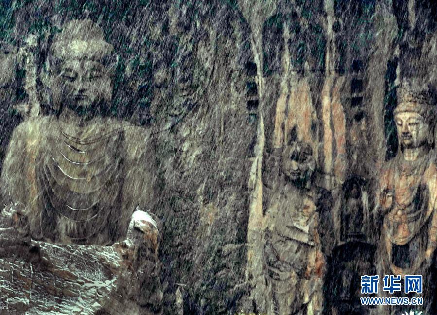 洛陽龍門石窟景區內的盧舍那大佛在雪中若隱若現(1月9日攝)。 新華社記者李安攝