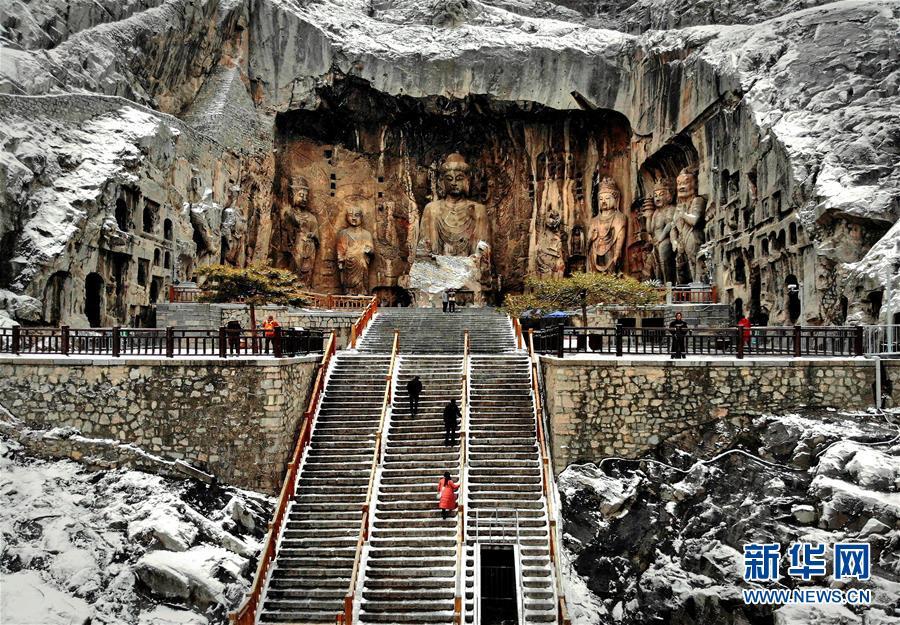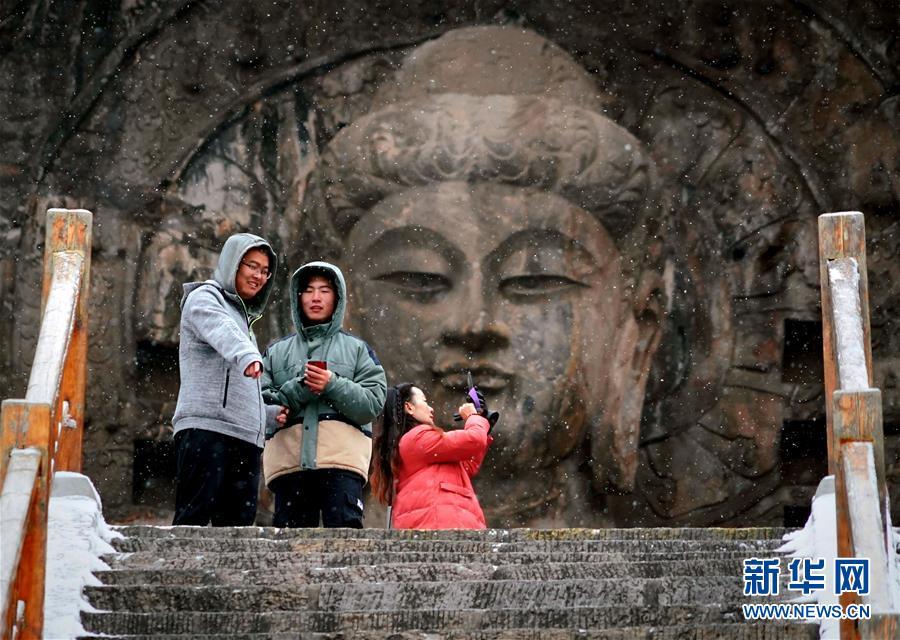 1月9日,游客在雪中游覽洛陽龍門石窟景區。 新華社記者李安攝