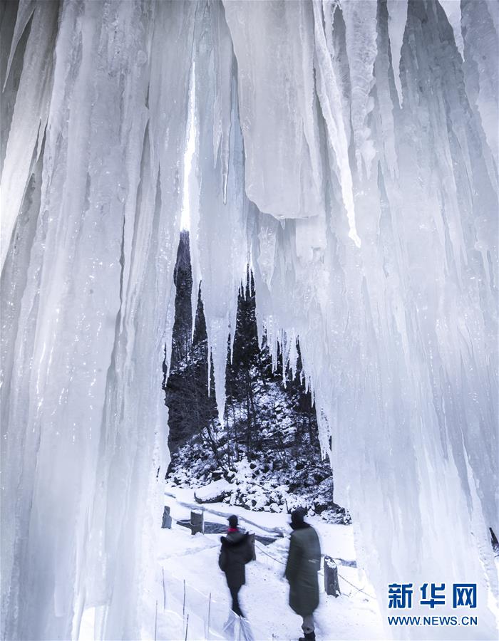 游人在吉林省長白縣十五道溝望天鵝景區內觀賞冰瀑景觀(1月3日攝)。新華社記者張楠攝