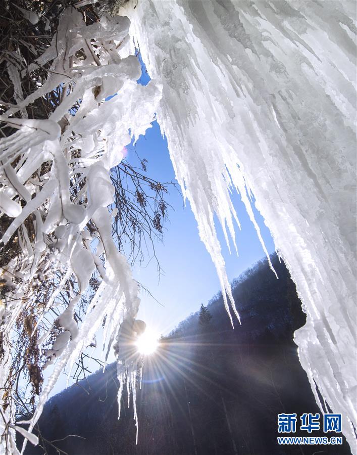 這是在吉林省長白縣十五道溝望天鵝景區拍攝的懸于石壁間的冰凌(1月3日攝)。新華社記者許暢攝