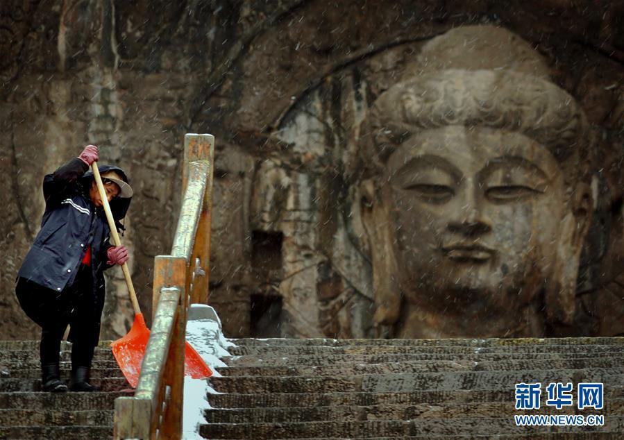 1月9日,清潔工在洛陽(yáng)龍門(mén)石窟景區(qū)內(nèi)的盧舍那大佛前清掃積雪。 新華社記者李安攝