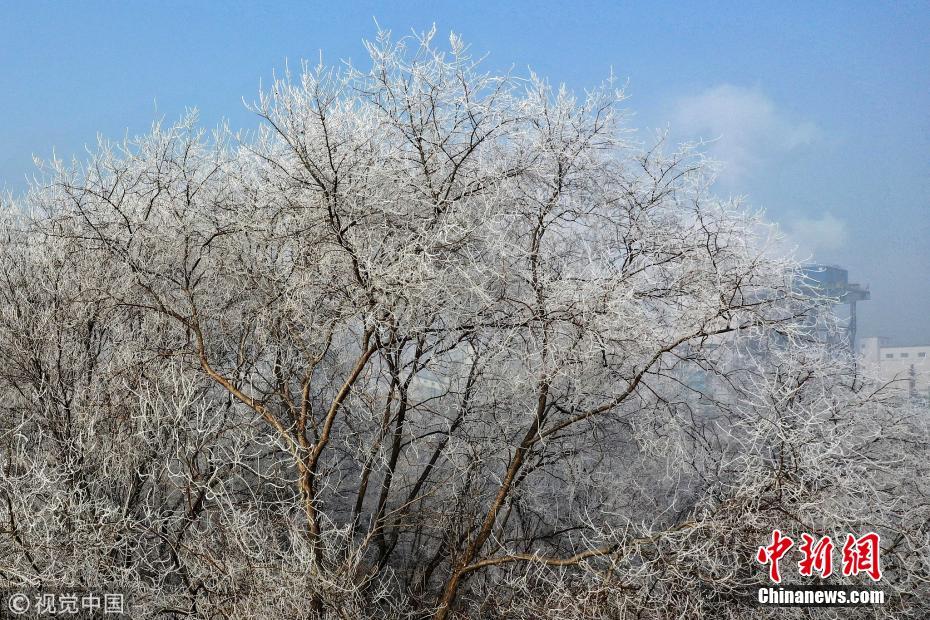 1月13日,霧散日升。河北省邢臺市大街小巷的樹枝上掛滿了潔白晶瑩的霜花,藍天下微風吹拂銀絲閃爍,奇麗壯觀。給臘八節日增添了亮麗的風景。霍紅軍 攝 圖片來源:視覺中國