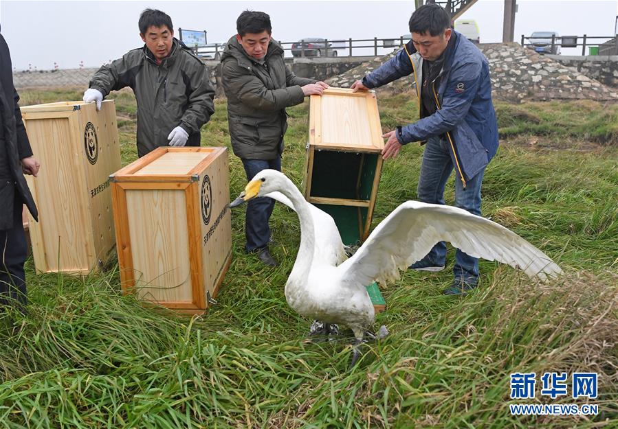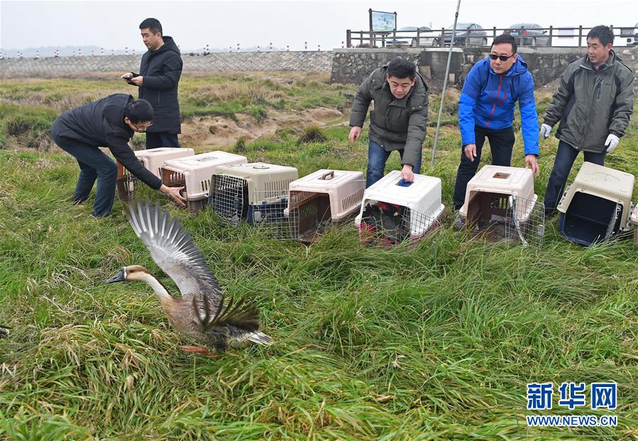 當日,江西省野生動植物救護繁育中心、天津市野生動物救護馴養繁殖中心在江西鄱陽湖國家級自然保護區將16只被救治的珍稀候鳥成功放飛。其中1只東方白鸛為國家一級保護動物,2只大天鵝、3只鴛鴦為國家二級保護動物。