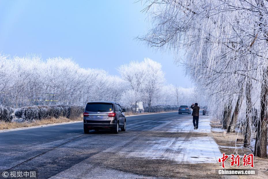 1月13日,107國道河北省定州路段出現霧凇(樹掛)景觀,吸引路人駐足拍照留念。王保生 攝 圖片來源:視覺中國