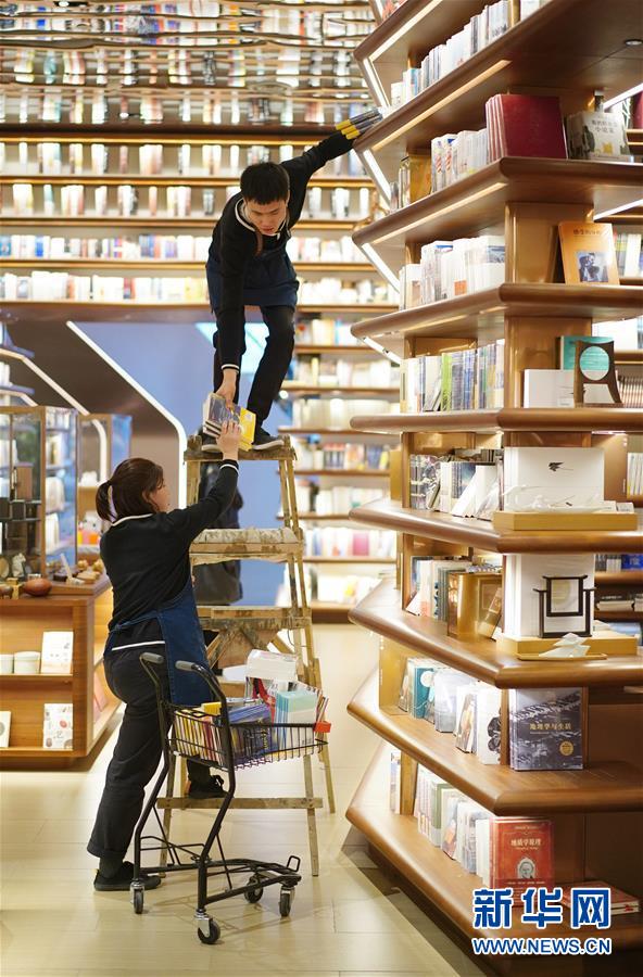 1月14日,西安高新區一家大型書店的工作人員在店內整理書籍。