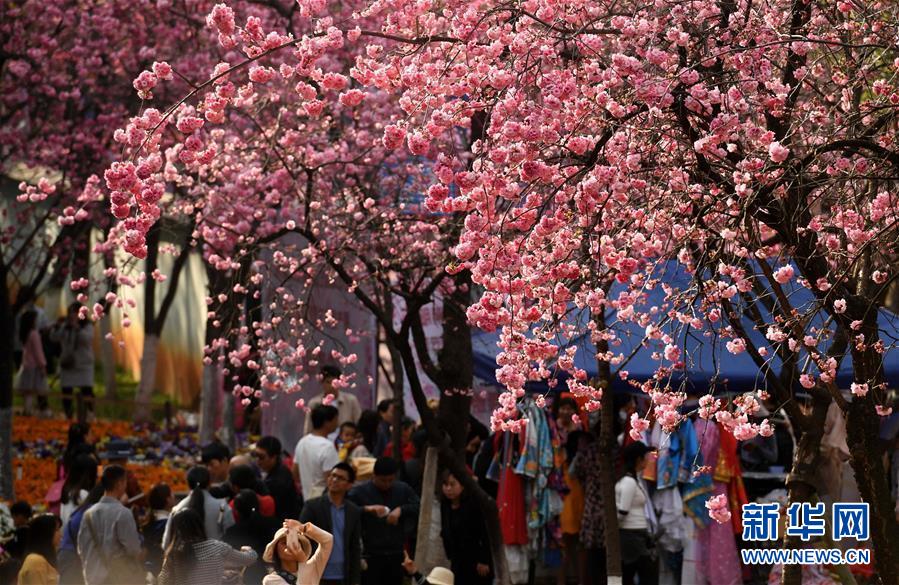 游人在昆明圓通山公園觀賞盛開的櫻花(3月16日攝)。近日,云南省昆明市迎來櫻花盛開的時節。昆明圓通山公園的數千株櫻花燦爛綻放,吸引了市民和游客前來觀花賞景。新華社記者藺以光攝