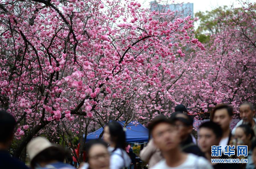 游人在昆明圓通山公園觀賞盛開的櫻花(3月16日攝)。近日,云南省昆明市迎來櫻花盛開的時節。昆明圓通山公園的數千株櫻花燦爛綻放,吸引了市民和游客前來觀花賞景。新華社記者秦晴攝