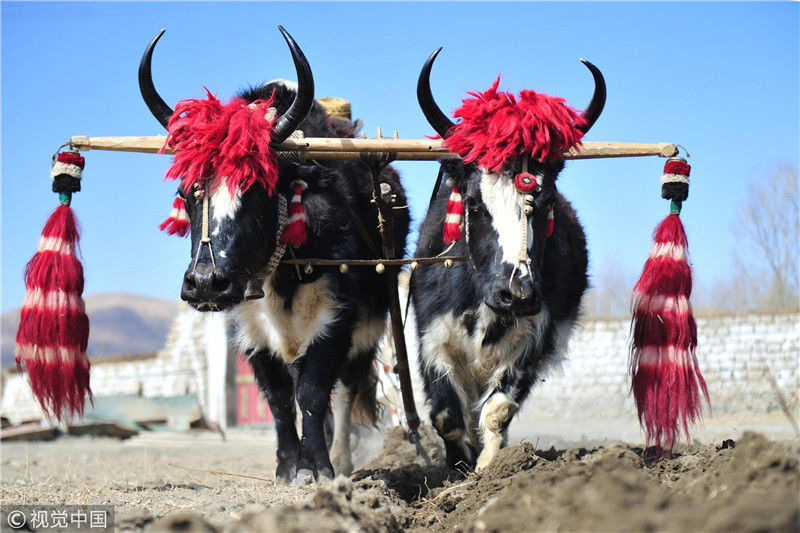 圖為白朗縣洛江鎮村民開耕犁出新年的第一壟青稞田,據悉,每年開耕節上,農牧民都會裝扮自家的耕牛。