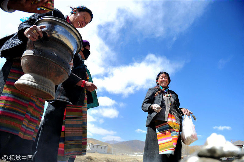 2019年3月16日,西藏各地迎來開耕節。位于年楚河畔的日喀則白朗縣被譽為“后藏糧倉”,當日,當地藏族農牧民將家里的耕牛裝扮一新,對農田進行開耕,大家齊聚青稞地,慶祝春播開始。圖為白朗縣洛江鎮民眾在青稞地里煨桑煙(一種祈福方式)、敬獻青稞酒,祈福新的一年風調雨順、五谷豐登。 江飛波(西藏分社)/中新社/視覺中國 編輯/陳進