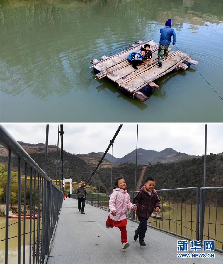 這是一張拼版照片:上圖為略陽縣徐家坪鎮(zhèn)藥木院村江口壩組的余皓軒(左)、劉紫涵(中),由余皓軒的外公劉德安撐上簡易木筏,去對岸的幼兒園上學(2018年11月22日無人機拍攝);下圖為余皓軒(前右)、劉紫涵(前左)放學歸來,手拉手走在新修的鋼結構吊橋上(2019年3月25日攝)。