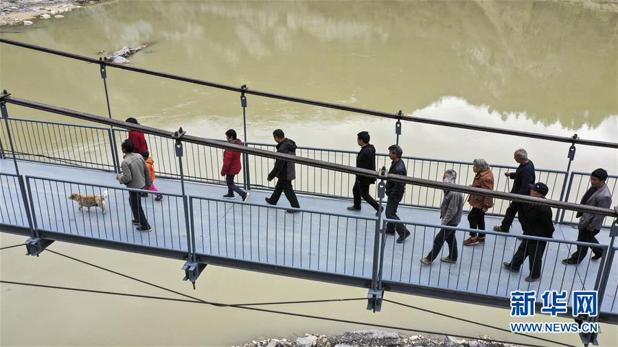 3月25日,略陽縣徐家坪鎮藥木院村村民走在新修的鋼結構吊橋上。 新華社記者陶明攝