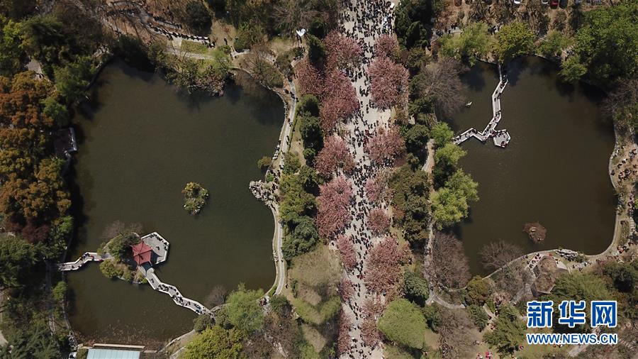 3月31日,游客在中國科學技術大學東區觀賞櫻花(無人機拍攝)。