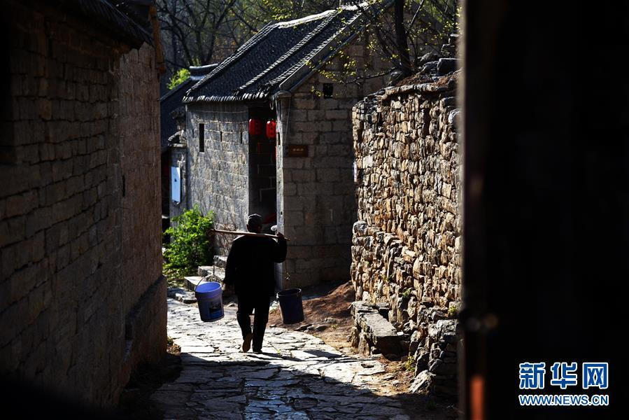 3月31日,村民挑擔走在上九山村的一條小道上。山東省鄒城市石墻鎮上九山村始建于宋代,是一座依山而建的石頭村,有明清建筑風格的古民居300余套,古樸傳統的村貌吸引眾多游客。2019年1月,上九山村入選第七批中國歷史文化名村。 新華社記者 王凱 攝