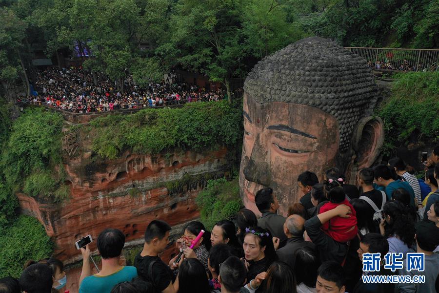 10月4日,游客在樂山大佛前排隊(duì)一睹大佛真容(無人機(jī)拍攝)。 新華社記者 江宏景 攝