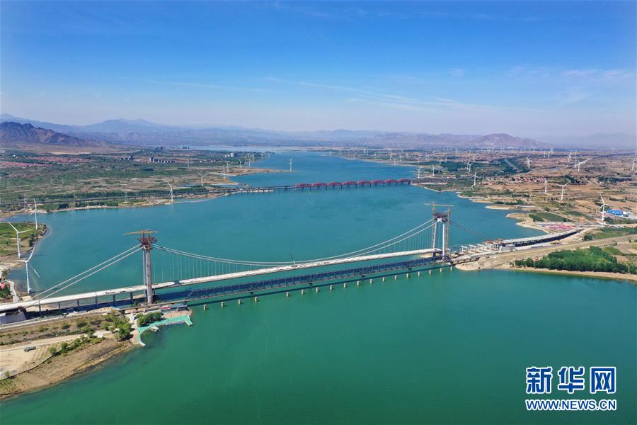 建設中的官廳水庫公路大橋(5月7日無人機拍攝)。 河北省懷來縣官廳水庫公路大橋是懷來沙城至東花園公路的節點工程,預計該橋將于2019年6月竣工。 新華社記者 楊世堯 攝