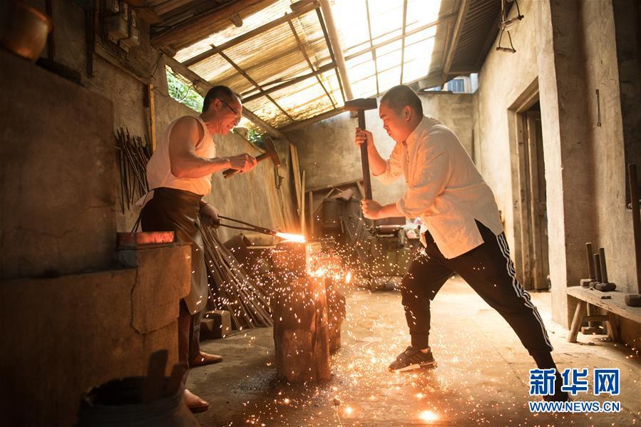 5月21日,鄭國榮和兒子鄭劍威在“古越劍鋪”對坯料進行鍛打。 鄭國榮,1964年生于浙江龍泉,已經跟寶劍打了30多年的交道。1982年他作為學徒進入龍泉市寶劍廠,1994年劍廠改制后,成立了工作室“古越劍鋪”,開始獨立的鑄劍生涯。 從兵器到精神的象征,鄭國榮一直對寶劍懷有敬畏之心。在他的工作室,一把寶劍,從理念形成、圖紙設計、備料到制作整合一般需要兩三個月。自劍鋪成立以來,他已帶了20多個徒弟,如今都成了有名的鑄劍師。他的兒子也在畢業后跟隨他鑄劍,目前已基本掌握了全流程的鑄造技藝。 新華社記者翁忻旸攝
