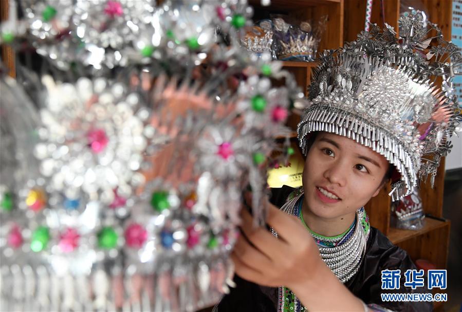 5月29日,在廣西融水苗族自治縣融水鎮,一名女青年在挑選苗族頭飾。