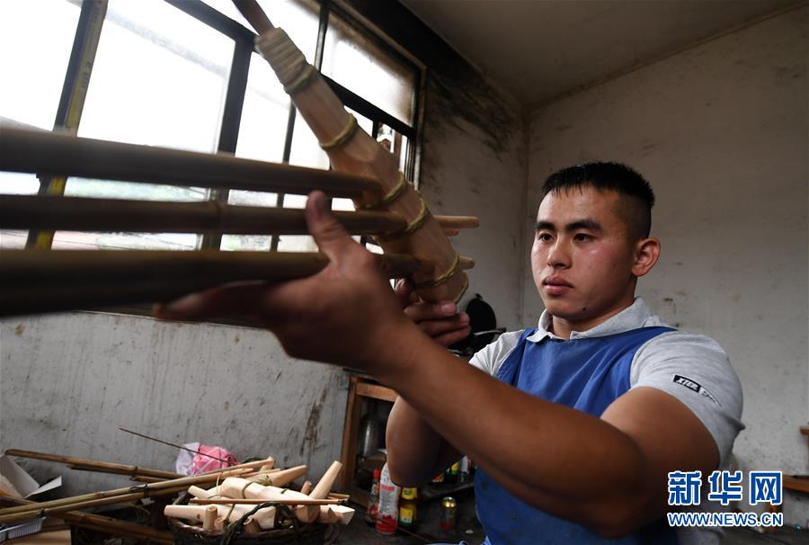 5月30日,在融水苗族自治縣安太鄉小桑村青山屯,杜信文在制作蘆笙。 新華社記者 陸波岸 攝