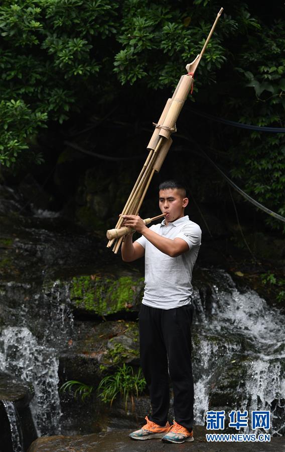 5月30日,在融水苗族自治縣安太鄉小桑村青山屯,杜信文在家門外試吹一把剛剛制作完成的蘆笙。 新華社記者 陸波岸 攝