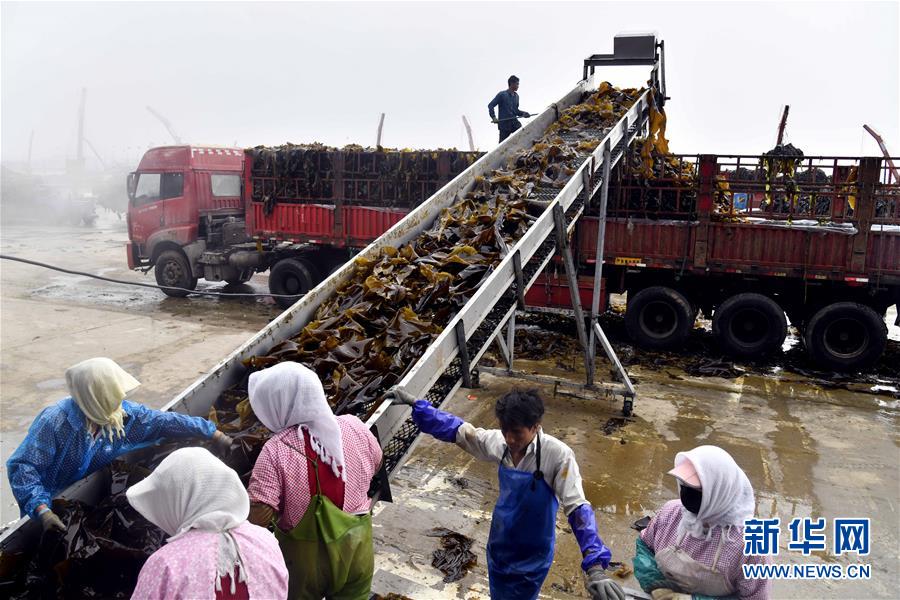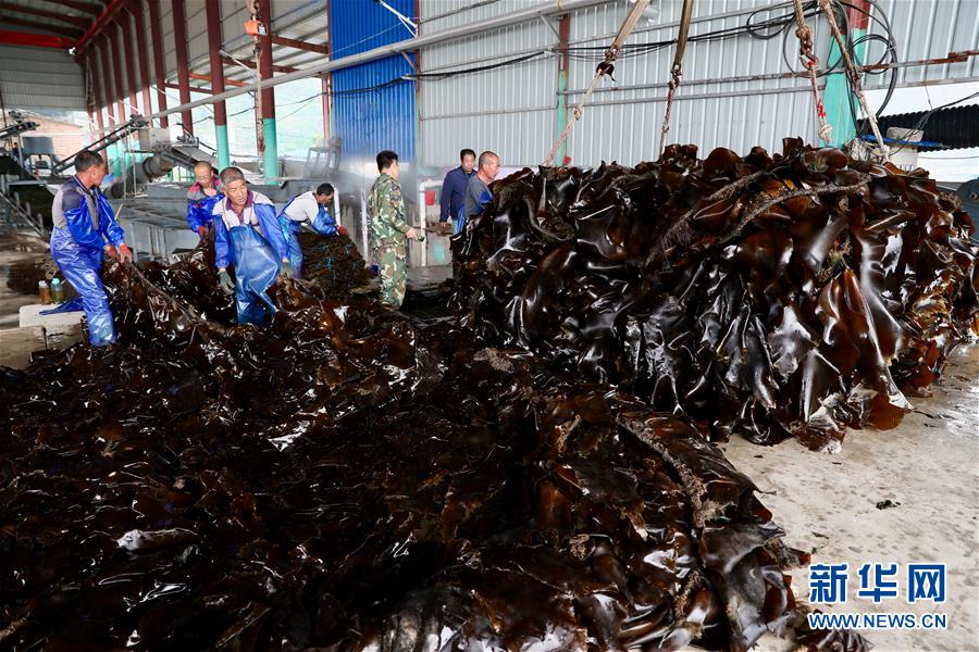 6月5日,在榮成市尋山街道青魚灘村,漁民在加工剛收獲的海帶。 近日,山東省榮成市迎來海帶收獲季。據悉,榮成市海帶養殖面積14.5萬畝,年產海帶43.3萬噸以上。 新華社記者郭緒雷攝