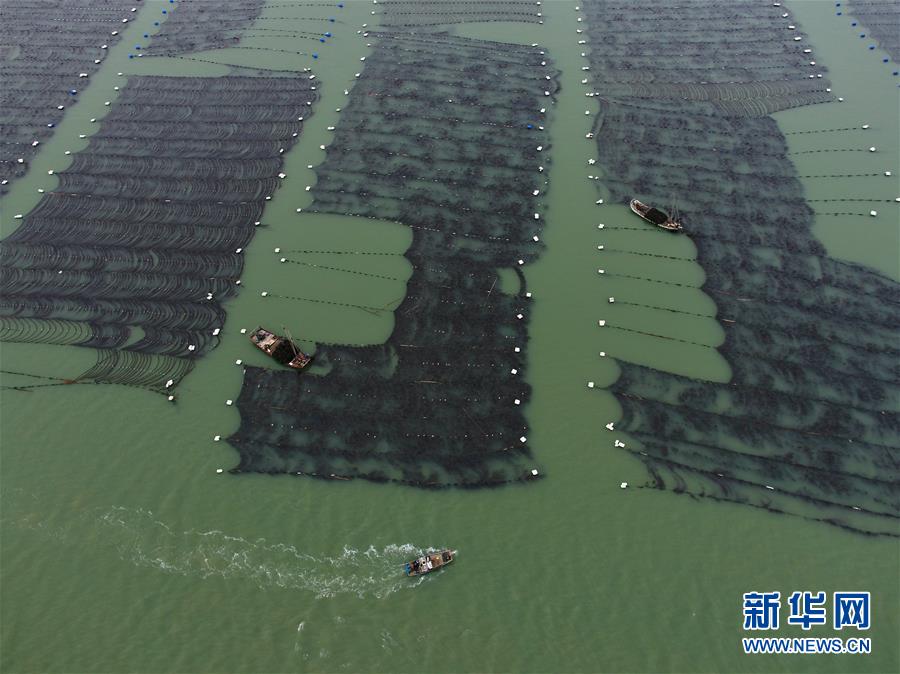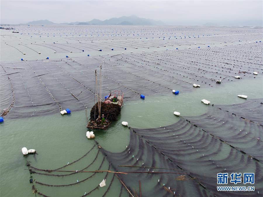 4月10日,霞浦縣長春鎮海域,海帶養殖戶在用船只運輸海帶(無人機拍攝)。近日,福建省寧德市霞浦縣30余萬畝養殖海帶進入收獲季節,當地養殖戶搶抓晴好天氣,收獲海帶。海帶養殖是霞浦縣群眾增收致富的支柱產業。2018年該縣海帶產量14萬余噸。新華社記者 姜克紅 攝