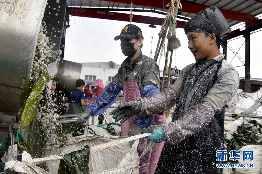 6月5日,在榮成一家水產養殖公司,工作人員在加工海帶。 近日,山東省榮成市迎來海帶收獲季。據悉,榮成市海帶養殖面積14.5萬畝,年產海帶43.3萬噸以上。 新華社記者林繁晶攝