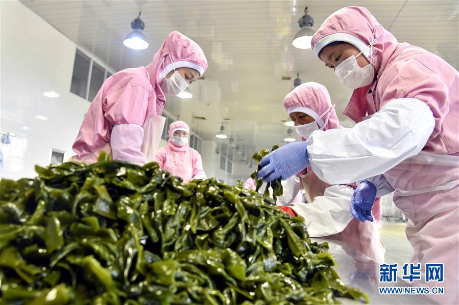 6月5日,在榮成一家水產養殖公司,工作人員在加工海帶。 近日,山東省榮成市迎來海帶收獲季。據悉,榮成市海帶養殖面積14.5萬畝,年產海帶43.3萬噸以上。 新華社記者郭緒雷攝