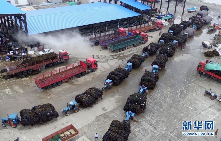 4月10日,霞浦縣長春鎮海帶養殖戶在埕塢碼頭吊運海帶。近日,福建省寧德市霞浦縣30余萬畝養殖海帶進入收獲季節,當地養殖戶搶抓晴好天氣,收獲海帶。海帶養殖是霞浦縣群眾增收致富的支柱產業。2018年該縣海帶產量14萬余噸。新華社記者 姜克紅 攝