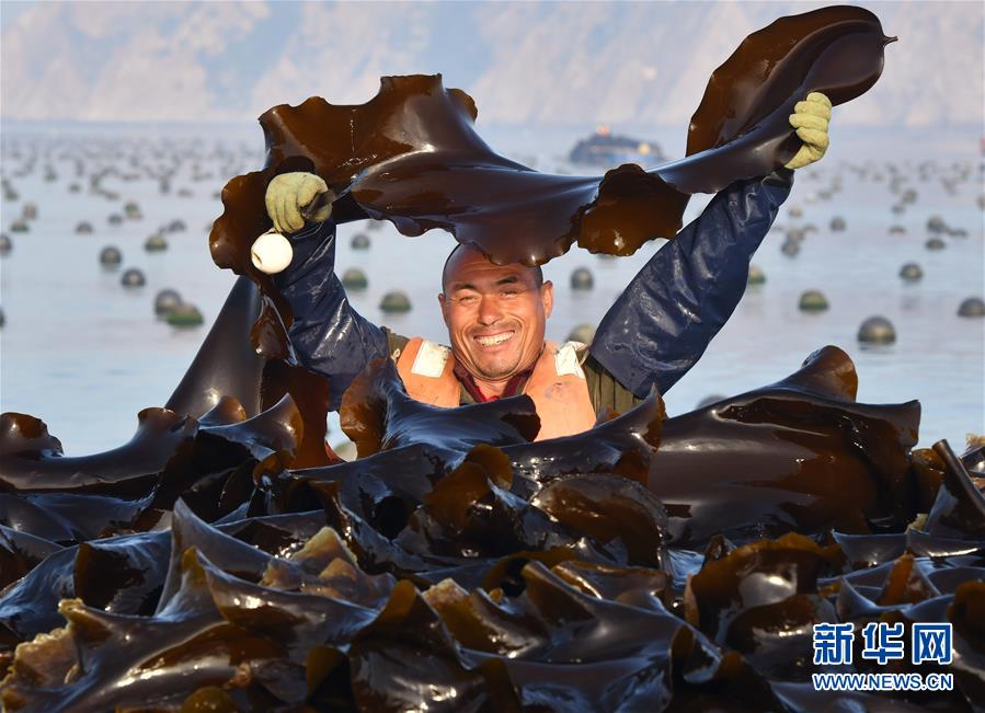 海島居民們在養殖區收割海帶(5月24日攝)。 新華社記者 朱崢 攝