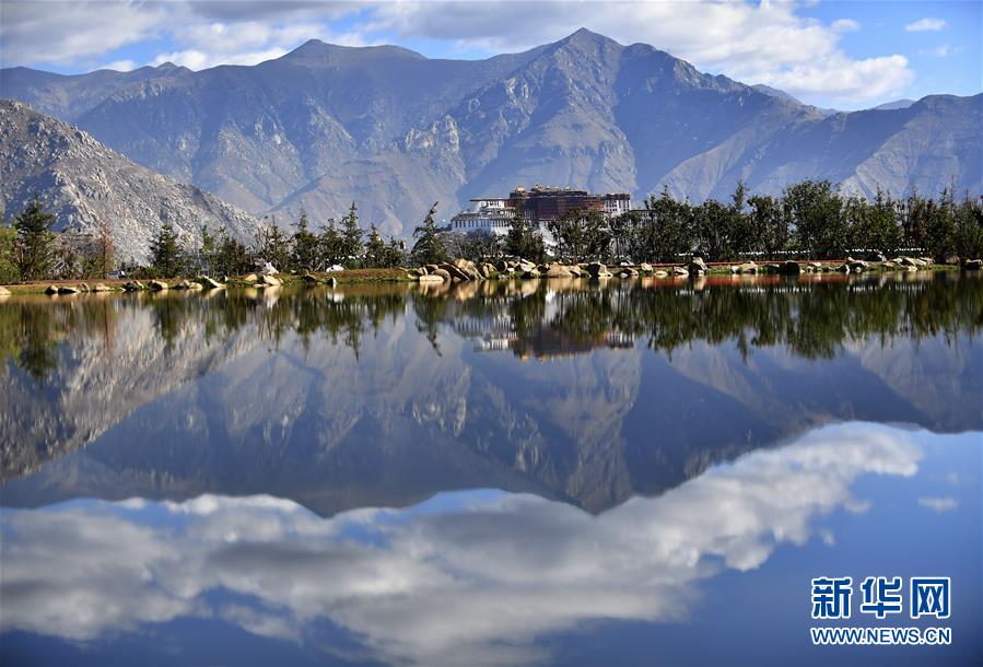 6月5日拍攝的藍天白云和綠水之間的布達拉宮。