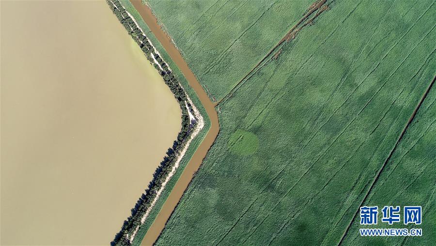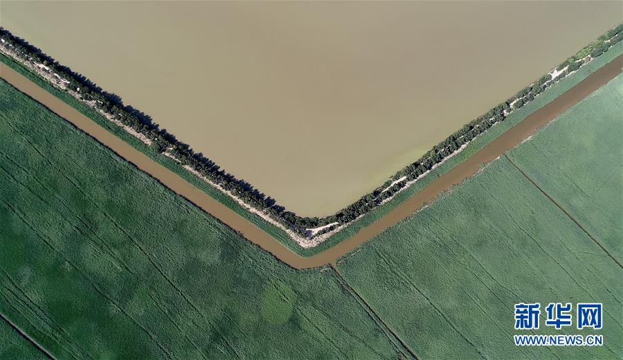 這是天津市寧河區七里海濕地內蘆葦和水面形成的圖案(6月22日無人機拍攝)。新華社記者 岳月偉 攝