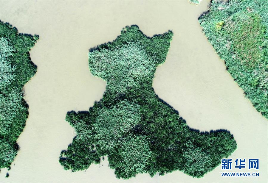 這是天津市寧河區七里海濕地內蘆葦和水面形成的圖案(6月22日無人機拍攝)。新華社記者 岳月偉 攝