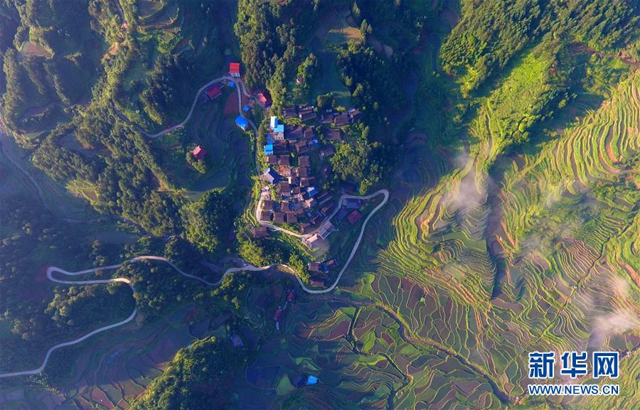 這是融水苗族自治縣桿洞鄉百秀村孔門苗寨的公路(6月14日無人機拍攝)。新華社記者 黃孝邦 攝