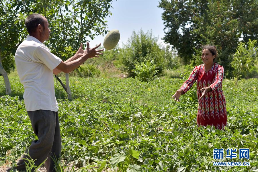 6月23日,新疆喀什地區巴楚縣的瓜農在采摘成熟的留香瓜。新華社記者 丁磊 攝