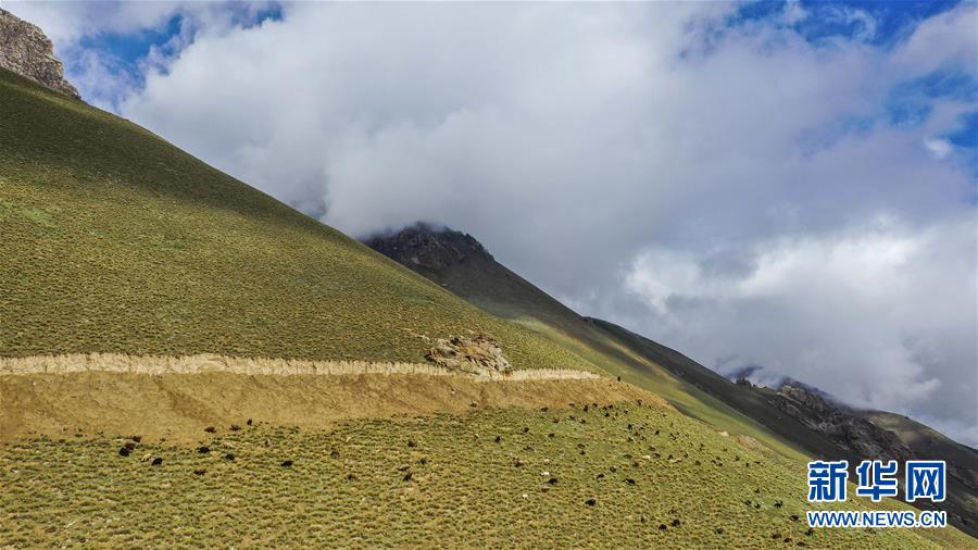 牛羊在拉依布拉克牧場覓食(6月22日無人機拍攝)。新華社記者 胡虎虎 攝