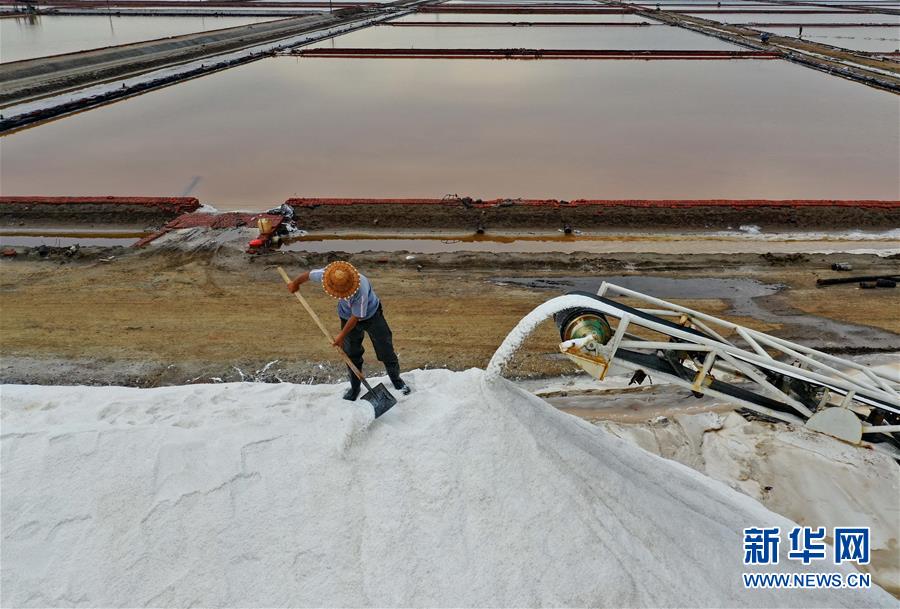 7月3日,唐山海港經濟開發區大清河鹽場的工人在鹽堆上工作。新華社記者 楊世堯 攝