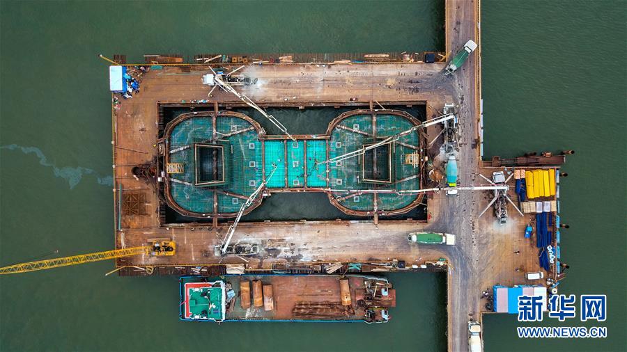 這是7月6日無人機拍攝的湛江調順跨海大橋東岸主塔墩承臺建設現場。 新華社記者 劉大偉 攝