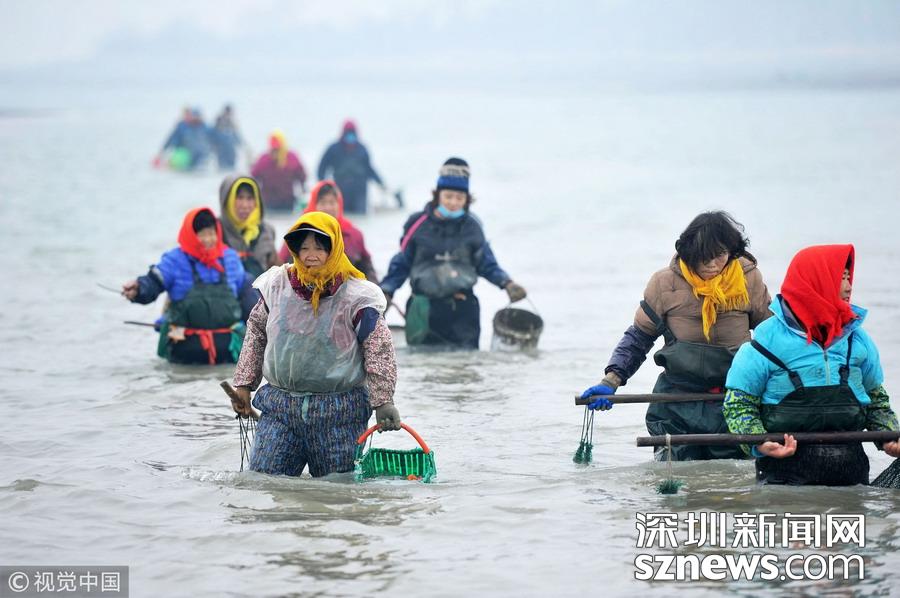 2018年12月22日,山東青島西海岸新區唐島灣南岸,市民蹚過海水帶回灣底挖到的海蠣子。