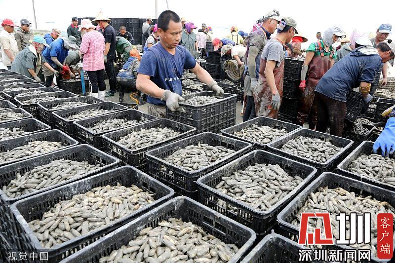 2019年7月9日,漁民們在江蘇連云港沿海地區海邊的灘涂上將剛收獲的海蟶運送上岸裝箱外運。
