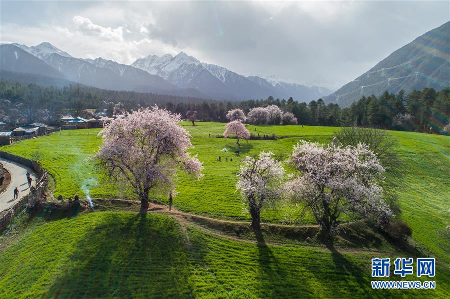 西藏林芝波密縣境內桃花盛開的田園風光(4月5日無人機拍攝)。
