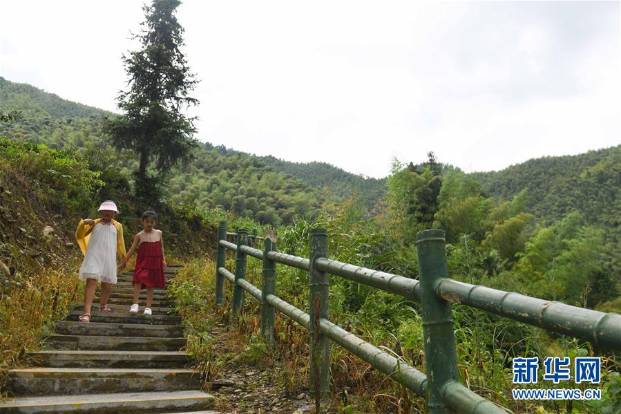 8月3日,小朋友行走在木坑竹海景區的小路上。夏日,安徽省黃山市黟縣的木坑竹海景區風景優美,吸引不少游客前來休閑避暑。新華社記者張端攝